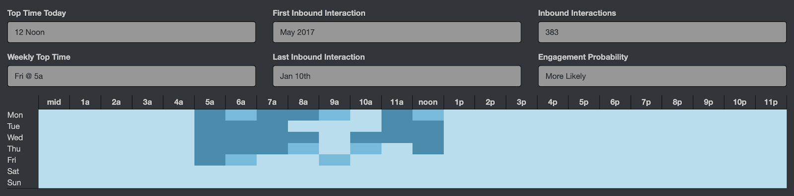 At the core of our tool is a machine learning engine that digests your email event data (opens, clicks, device type, etc). Based on your historic data in HubSpot, Seventh Sense generates profiles on how each individual in your database interacts with your emails.