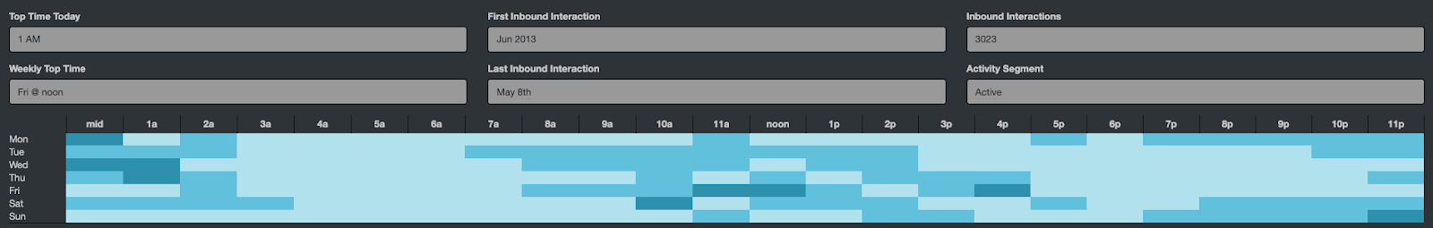 Both of this and the profile below come from C Level executives. The overall time range they are responsive to email is much wider, but at the same time, you don’t see the same large consistent blocks of availability.